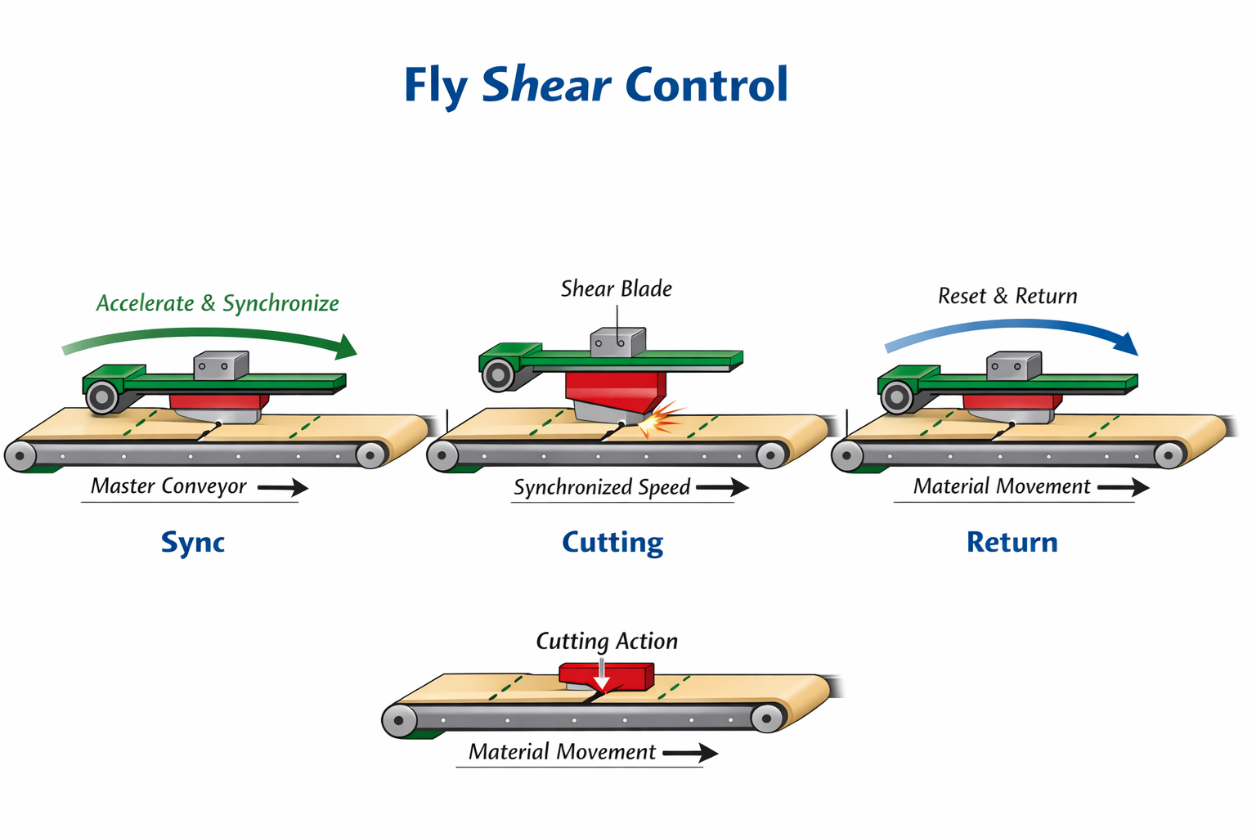 در Flying Shear، تیغه برش با سرعت نوار تولید هم‌سرعت می‌شود، عمل برش را انجام می‌دهد و سپس از خط جدا می‌شود؛ بدون توقف خط تولید.